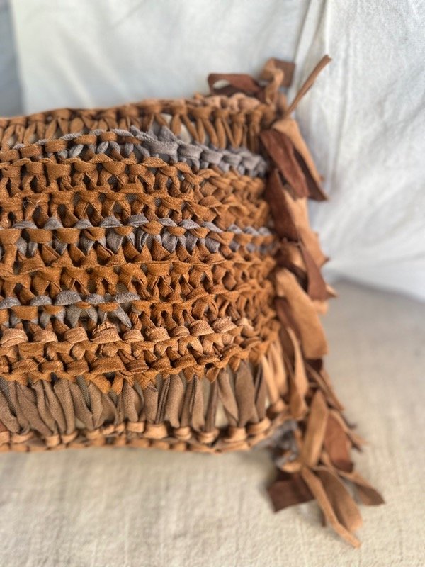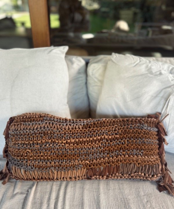 Almohadón cilindro en tonos de marrones tejido a mano con tiras gamuzadas y flecos en los bordes
